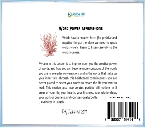 CD Created by Jackie Hill, qualified clinical hypnotherapist and psychotherapist. Words have a creative force (for positive and negative things) therefore we need to speak words wisely.  Learn to listen carefully to the words you use.